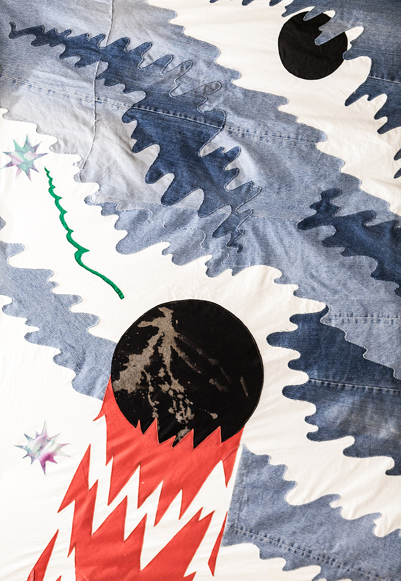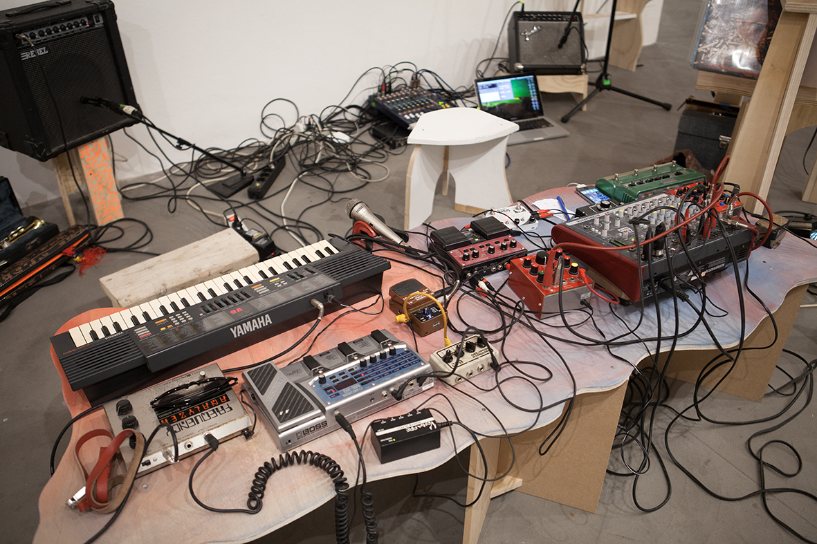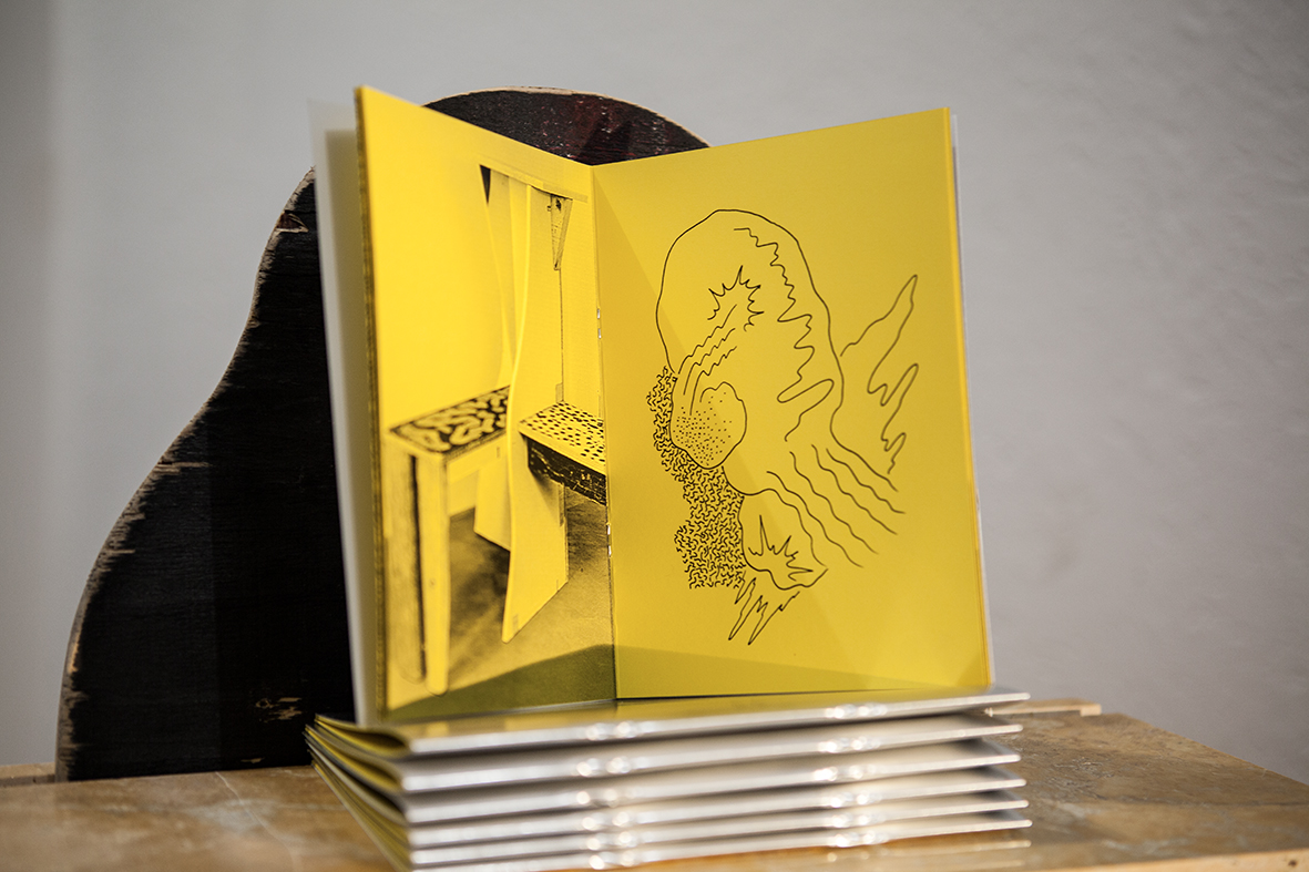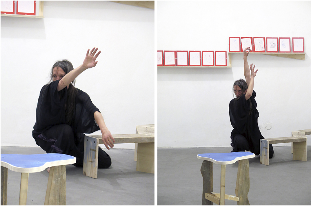 Una selezione di grafiche, serigrafie, disegni, poster ed arazzi interagiscono con i Mochini, collage di legno e marmo in forma di sedute, sgabelli e panche da visione. Oggetti liberi gravitano nello spazio rivolgendo lo sguardo alle deli- cate e organiche raffigurazioni alle pareti. I disegni si manifestano e comunica- no con le rappresentazioni plastiche e materiche creando un’analogia valida in entrambe le direzioni.