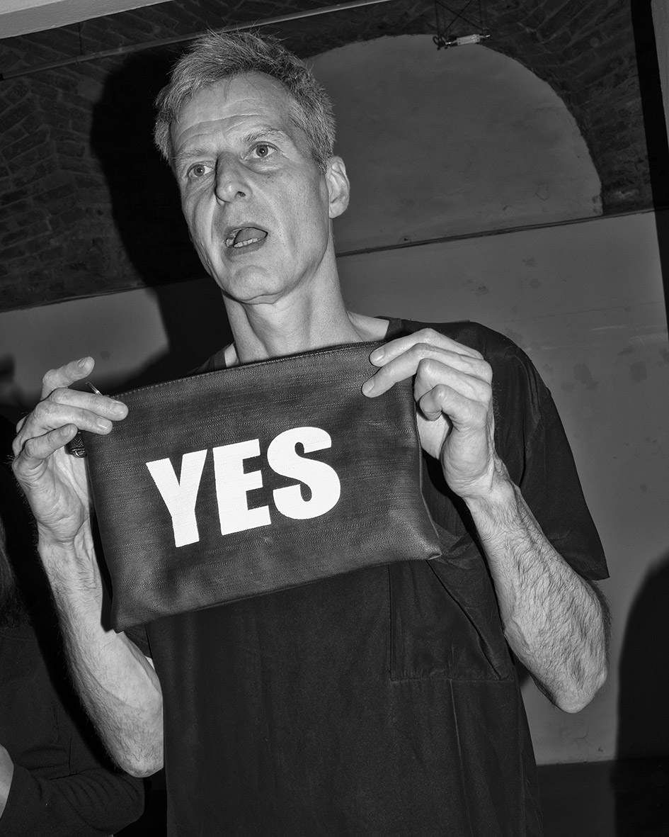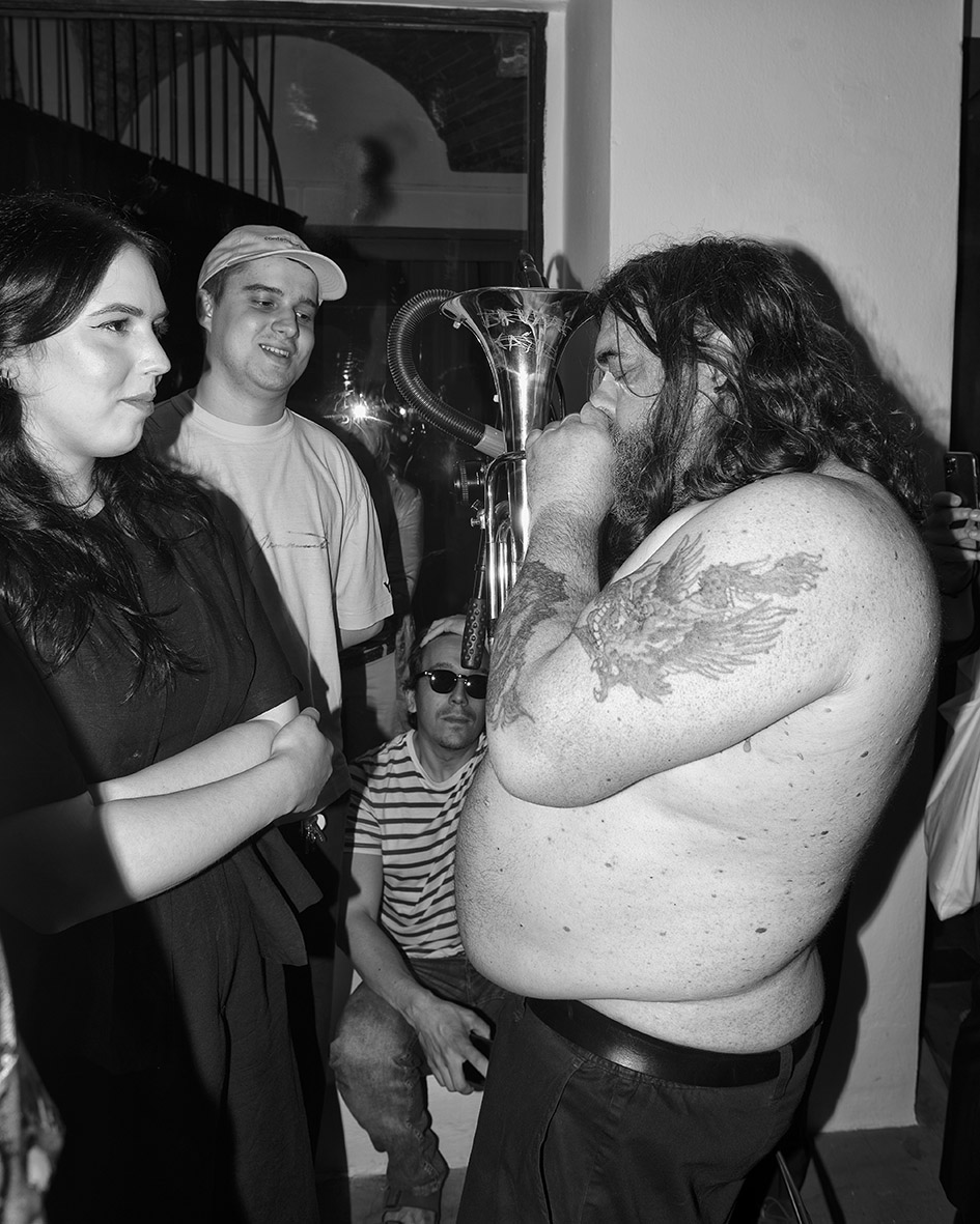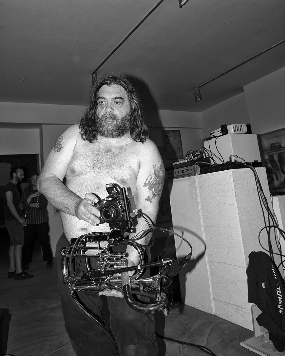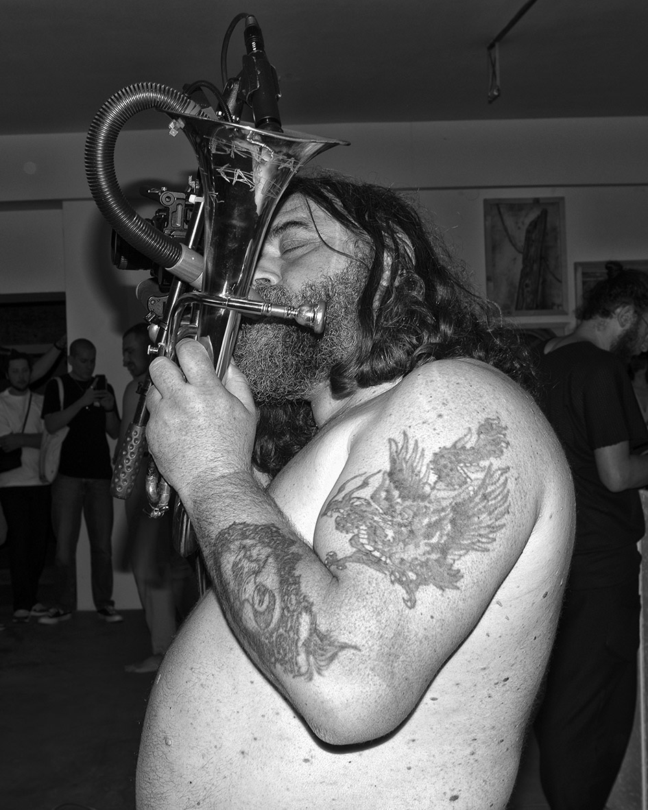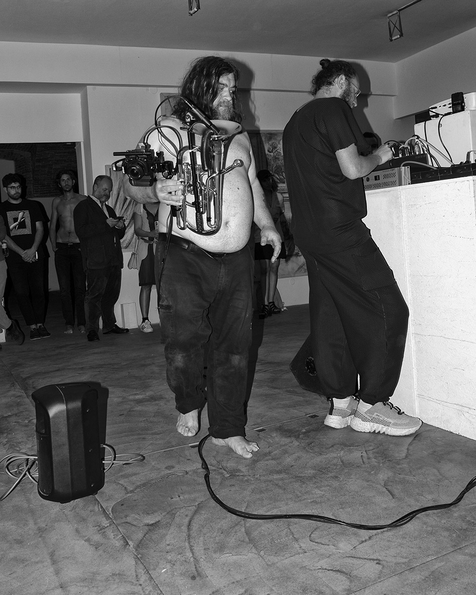 A seguire, l’atmosfera si accende di tinte dionisiache con il live concert di Khan of Finland, musicista electro-acid-techno amico e collaboratore di Benassi sin dai tempi del Btomic. I flash delle fotografie non si interrompono e adesso illuminano le movenze di questo fauno nordico. Impossibile ormai stabilire univocamente il loro ruolo: ausili alla documentazione della performance, metronomi di un ritmo creativo disallineato con quello musicale, segnali visivi che il rituale sta generando nuove immagini, contributi estetici per una commedia degli equivoci.