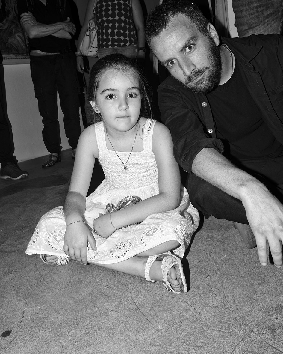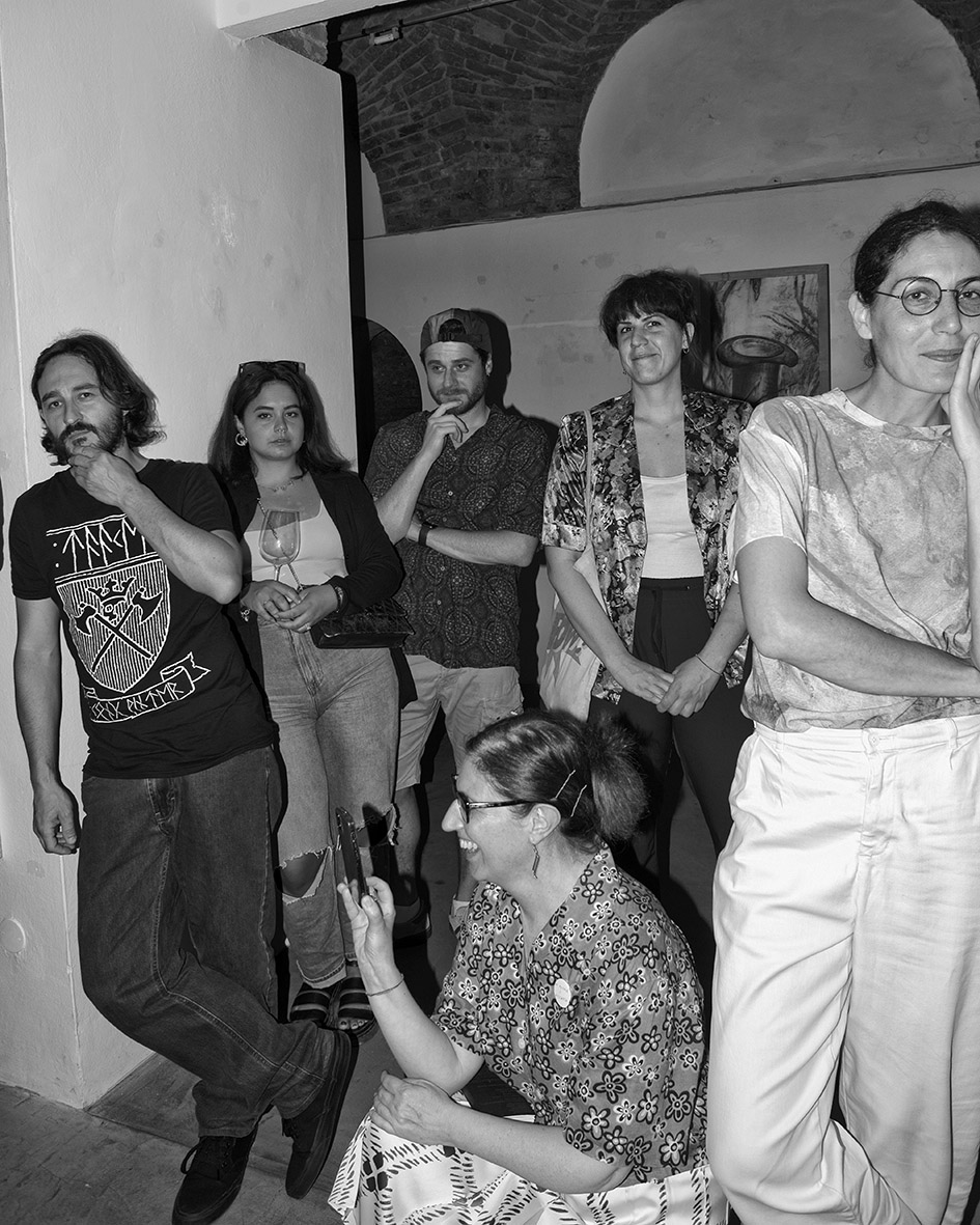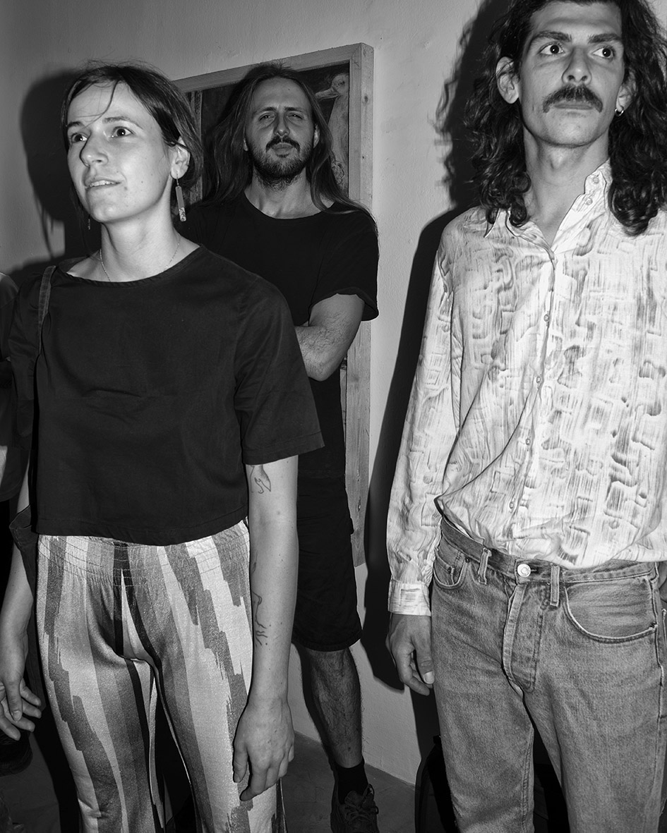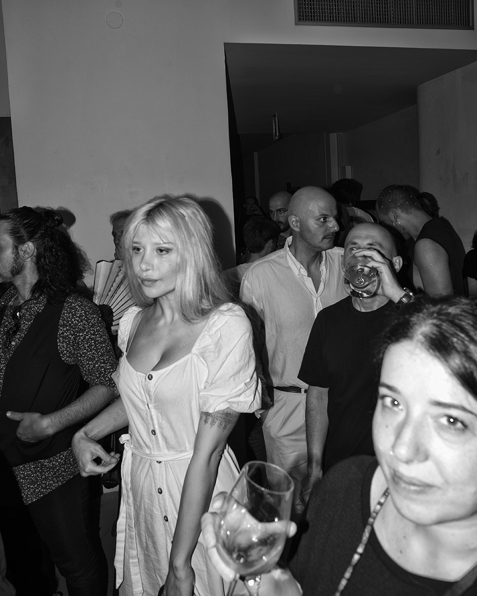 Jacopo Benassi, Anfitrione, con Khan of Finland e Canedicoda, durante l’opening di Racconti Domestici di Lorenzo D’Anteo