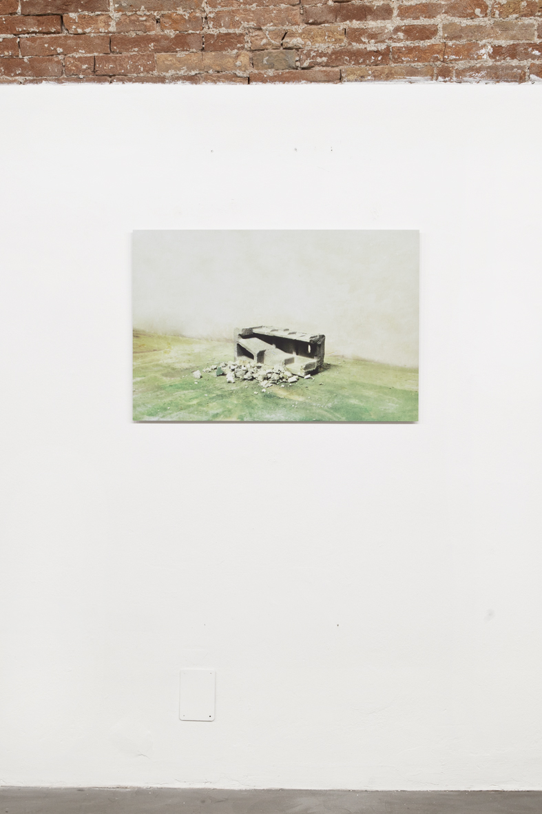 Questo personale approccio è nato in seguito al terremoto dell’ Emilia del 2012. “Abito nella zona del sisma – spiega Monari – ma non ho mai voluto fare un reportage fotografico sul terremoto, non fa parte della mia sensibilità. In questi anni mi sono limitato ad osservare e a prendere appunti.” A distanza di 5 anni, Monari da forma alle sue osservazioni costruendo e fotografando dei manufatti indefiniti e fragili. Anche i piani di posa, così come i fondali, spiegazzati e sporchi di colore, sono elementi fondamentali della composizione. Non è più, quindi, un porsi di fronte ad un paesaggio e ad una realtà già pronte, ma una completa partecipazione dell’artista che rielabora mentalmente il luogo e ne propone una propria visione. Queste nature morte diventano la rappresentazione delle case pericolanti, del paesaggio lacerato, delle macerie e degli edifici messi in sicurezza. La fotografia diventa dunque la testimonianza di questo processo, prima di tutto mentale, ma anche plastico.