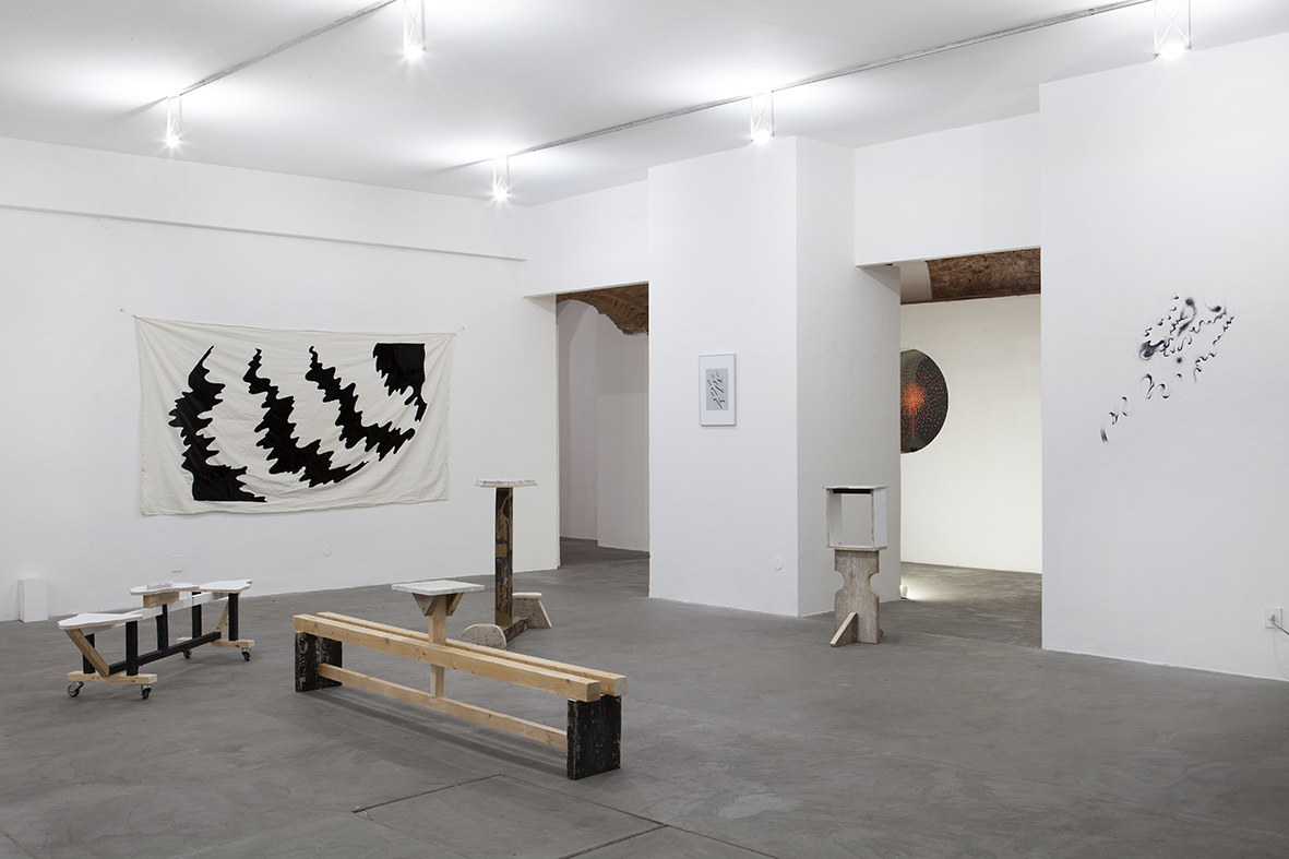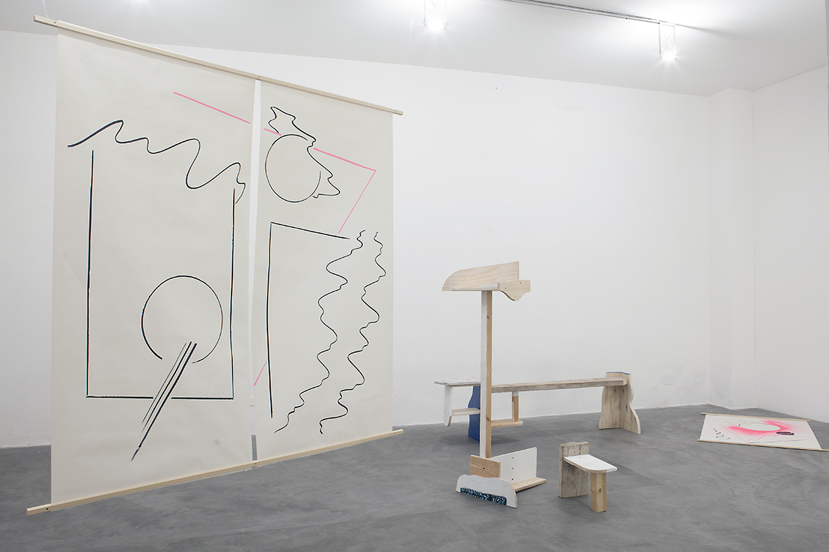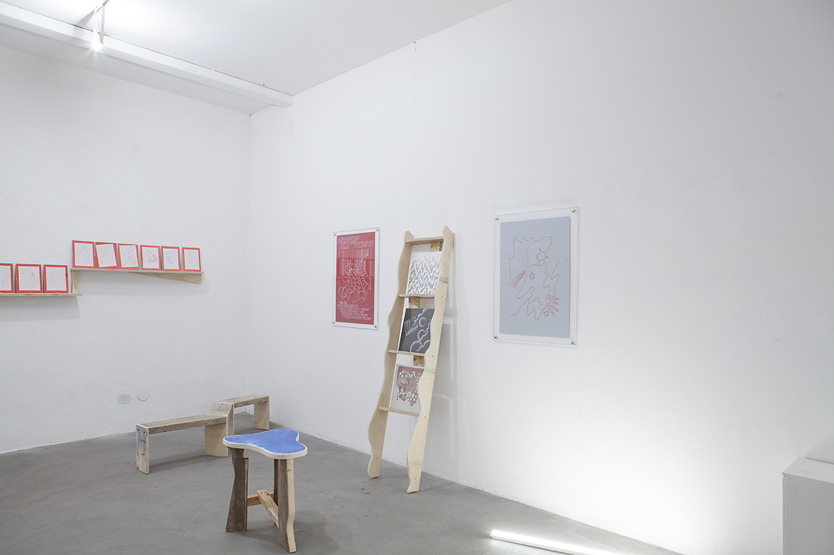Una selezione di grafiche, serigrafie, disegni, poster ed arazzi interagiscono con i Mochini, collage di legno e marmo in forma di sedute, sgabelli e panche da visione. Oggetti liberi gravitano nello spazio rivolgendo lo sguardo alle delicate e organiche raffigurazioni alle pareti. I disegni si manifestano e comunicano con le rappresentazioni plastiche e materiche creando un’analogia valida in entrambe le direzioni.