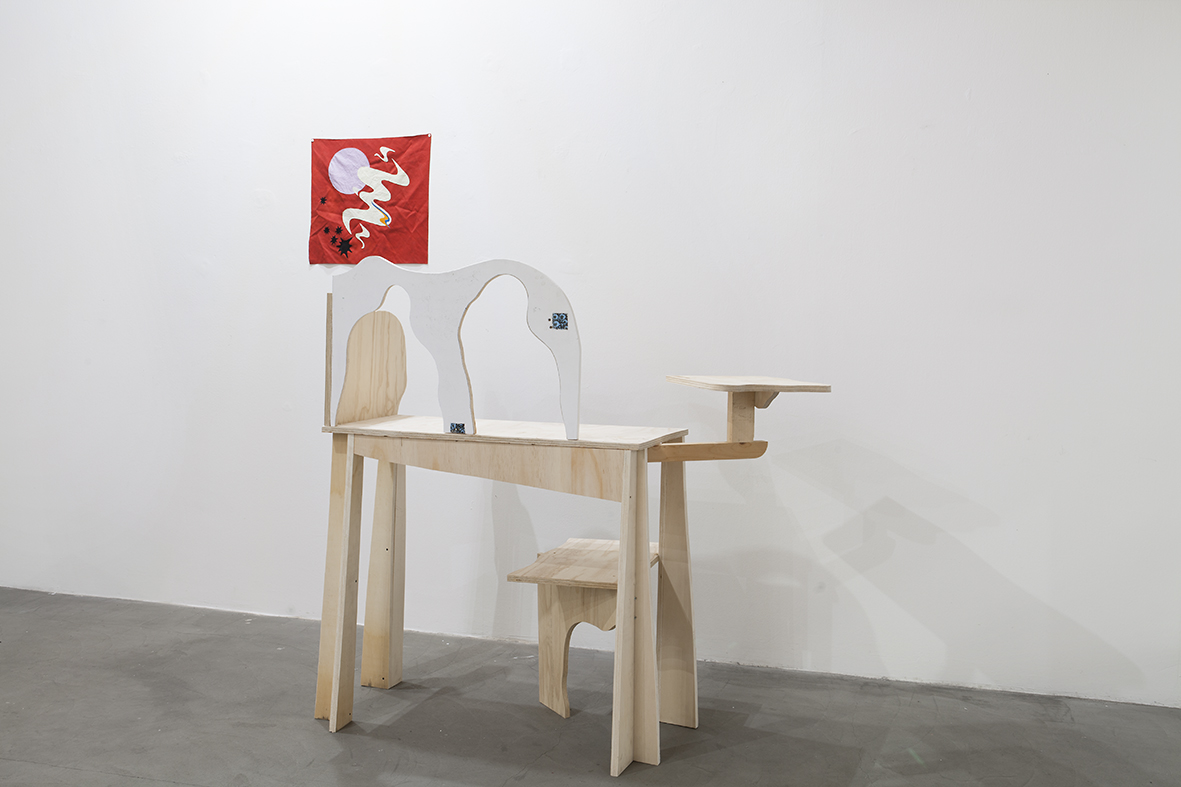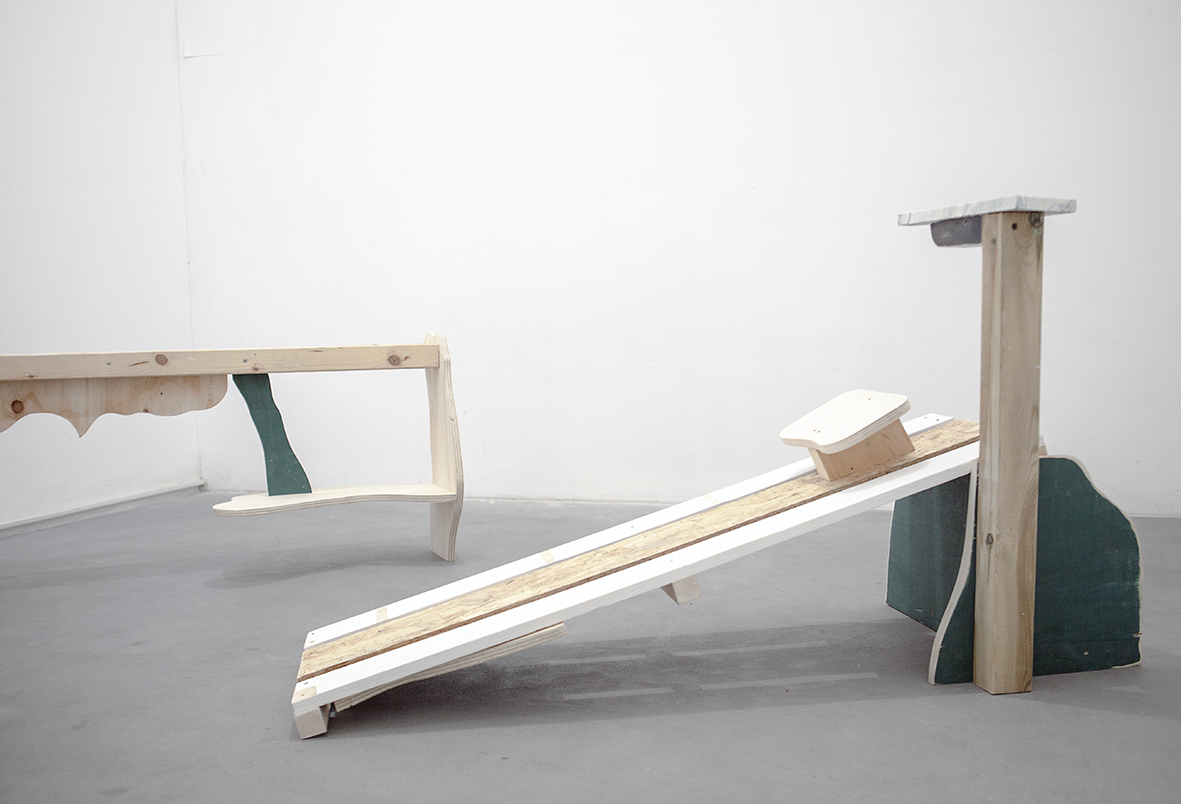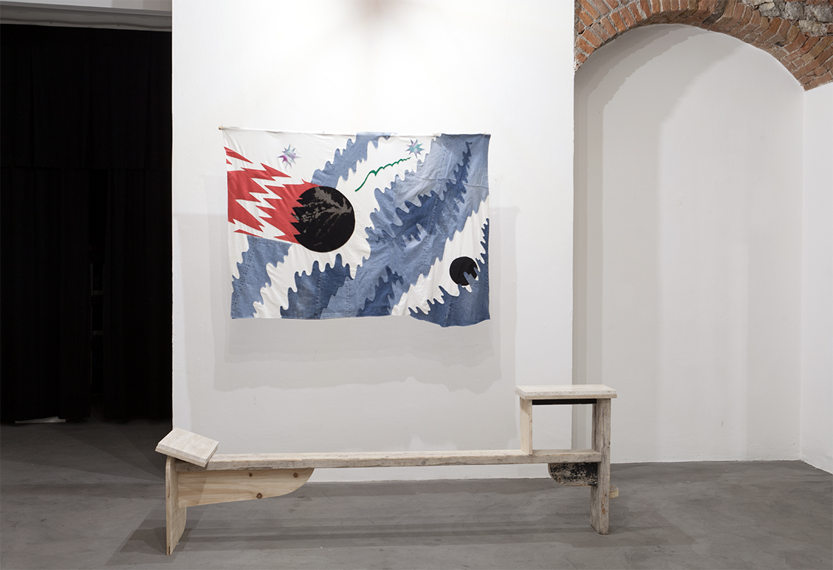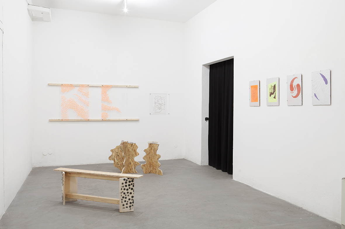 Una selezione di grafiche, serigrafie, disegni, poster ed arazzi interagiscono con i Mochini, collage di legno e marmo in forma di sedute, sgabelli e panche da visione. Oggetti liberi gravitano nello spazio rivolgendo lo sguardo alle delicate e organiche raffigurazioni alle pareti. I disegni si manifestano e comunicano con le rappresentazioni plastiche e materiche creando un’analogia valida in entrambe le direzioni.