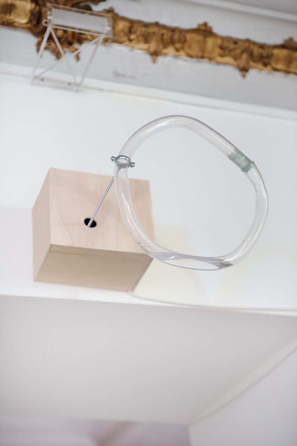 Una scultura sonora cinetica, composta da tre flauti circolari realizzati in materiale trasparente. Ognuno di questi flauti è riempito d’acqua e costituisce un modulo sonoro autonomo all’interno di un’installazione armonicamente accordata. Attraverso un movimento oscillatorio generato meccanicamente, i flauti entrano in vibrazione e iniziano a suonare da soli. L’aria viene spinta attraverso una stretta fessura centrale, mentre l’acqua in movimento modula continuamente l’altezza e il timbro del suono.