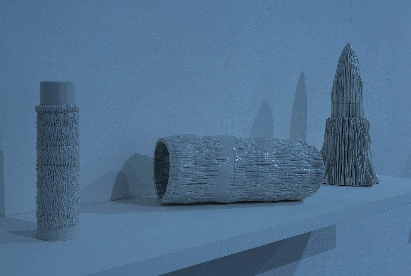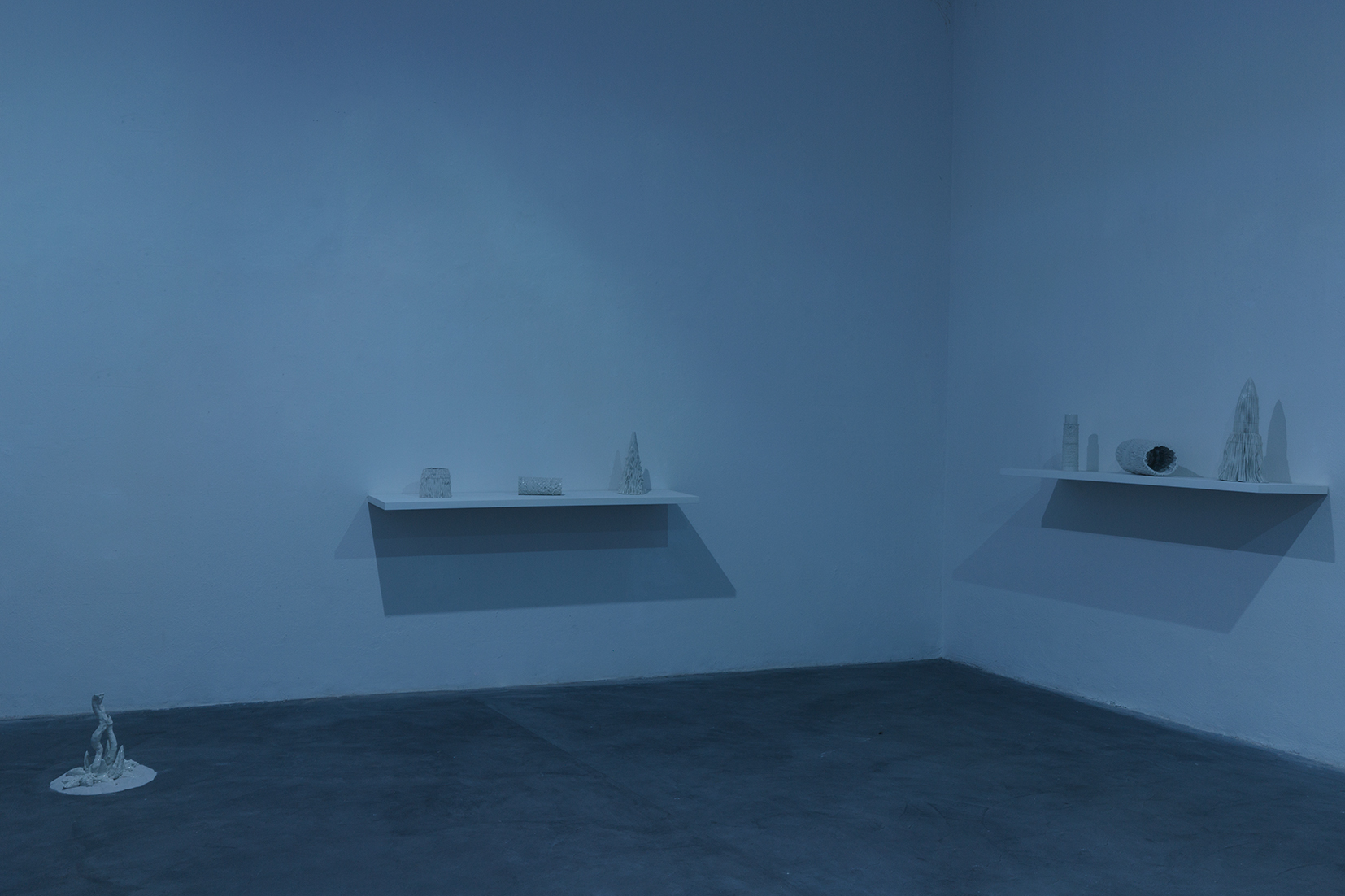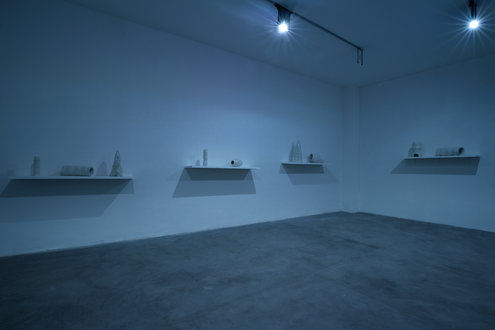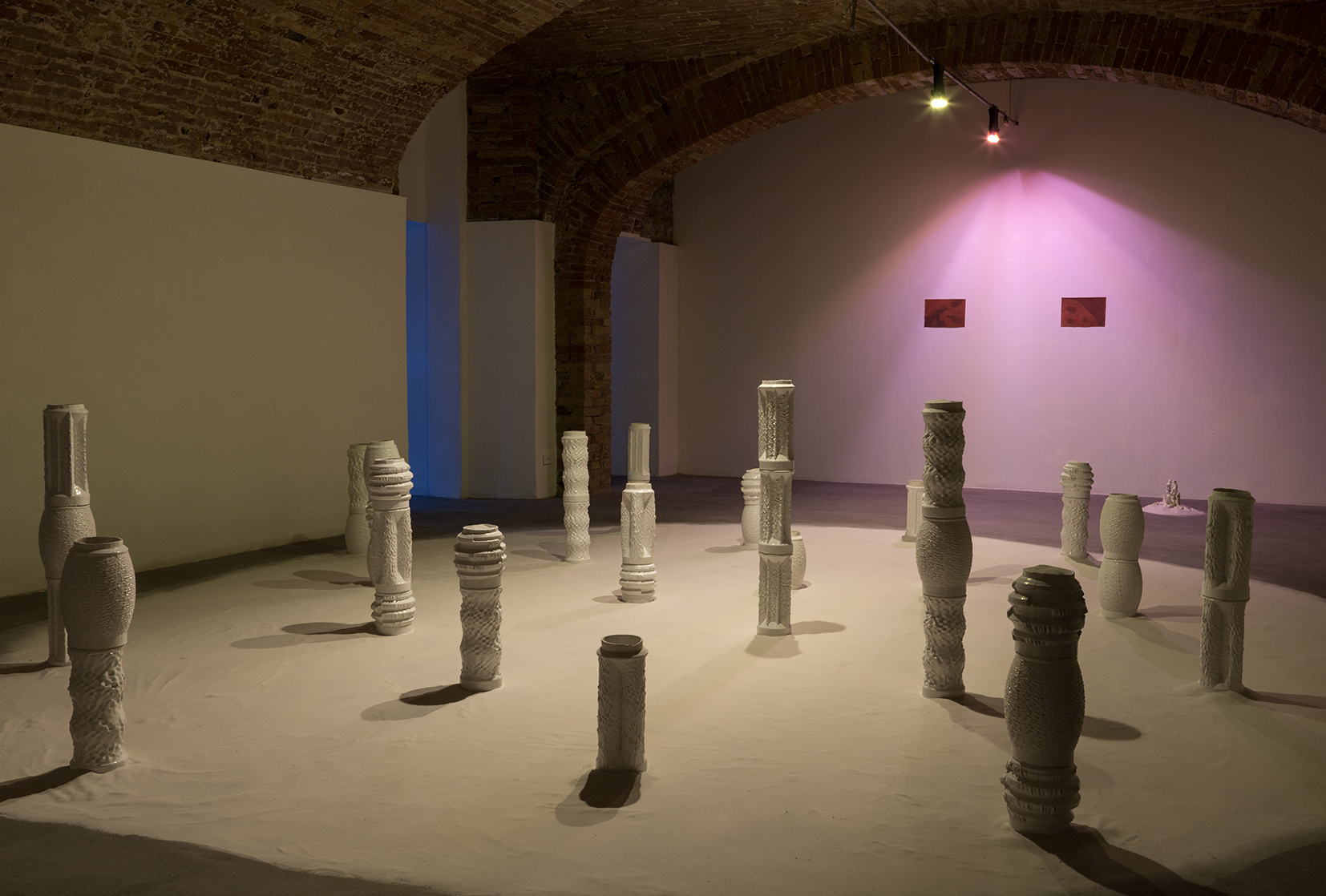 Colonne cave e vasi torniti emergono dal delicato pavimento con una composizione più simi- le a una vegetazione spontanea che a una rovina architettonica progettata da menti umane. Ma più che la loro posizione e vicinanza, ciò che colpisce è la forma irregolare di tali rigidi otri ripieni di sabbia. Realizzati in un materiale molto simile alla porcellana, i loro corpi smaltati iniziano a dialogare con le tenui colorazioni dell’alba che ora si avvicina. Ma, diversamente dalle processioni di corpi e racconti che in antichità affollavano le colonne istoriate o i vasi dipinti, tali costruzioni non sono arricchite da disegni o fregi decorativi.
