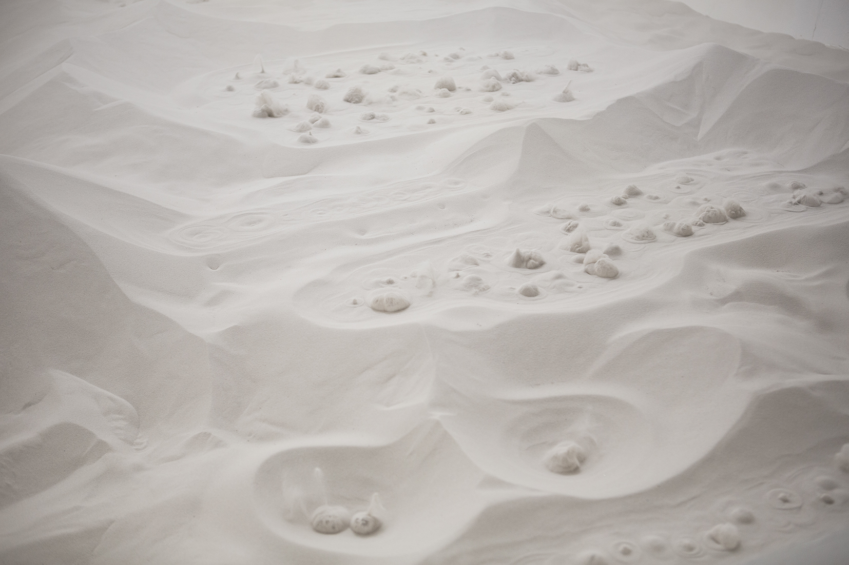 “Come in un sogno, o su un altro pianeta, le leggi della fisica sembrano comportarsi in maniera differente”, suggerisce il curatore Davide Daninos. “Così bassa marea desidera trasportare l’immaginazione dei visitatori su pianeti diversi, dove l’attività onirica è in grado di costruire oggetti e architetture. E il suo paesaggio è continuamente modificato dai diversi desideri e intuizioni della sabbia. La cui alta e bassa marea tiene sempre in movimento l’intero spazio espositivo.”